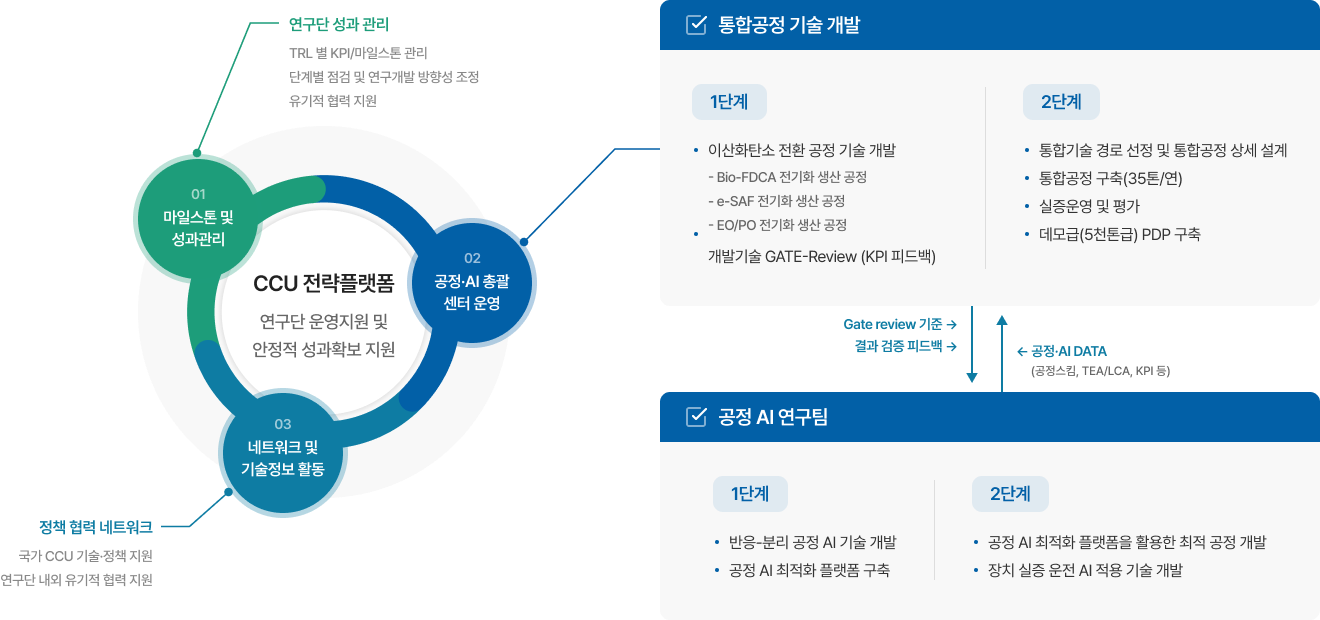 또한 개별 세부 기술을 연계한 CCU 통합 공정 기술을 개발하고, 실증 설비 구축을 통해 공정 성능과 기술 신뢰성을 평가·검증하고자 합니다.
