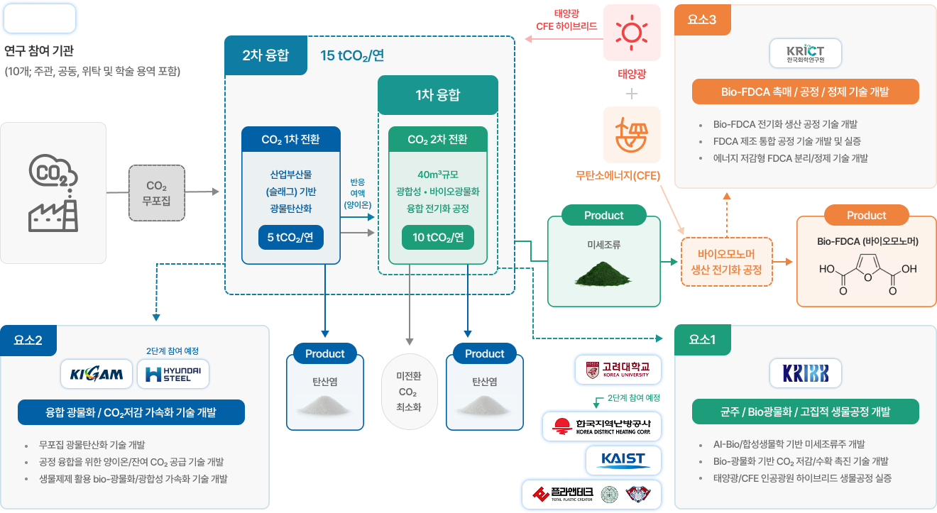 세부과제 3은 생물기술과 광물화기술을 세계 최초로 복합 연계한 CCU 융합기술 개발을 목표로 합니다.