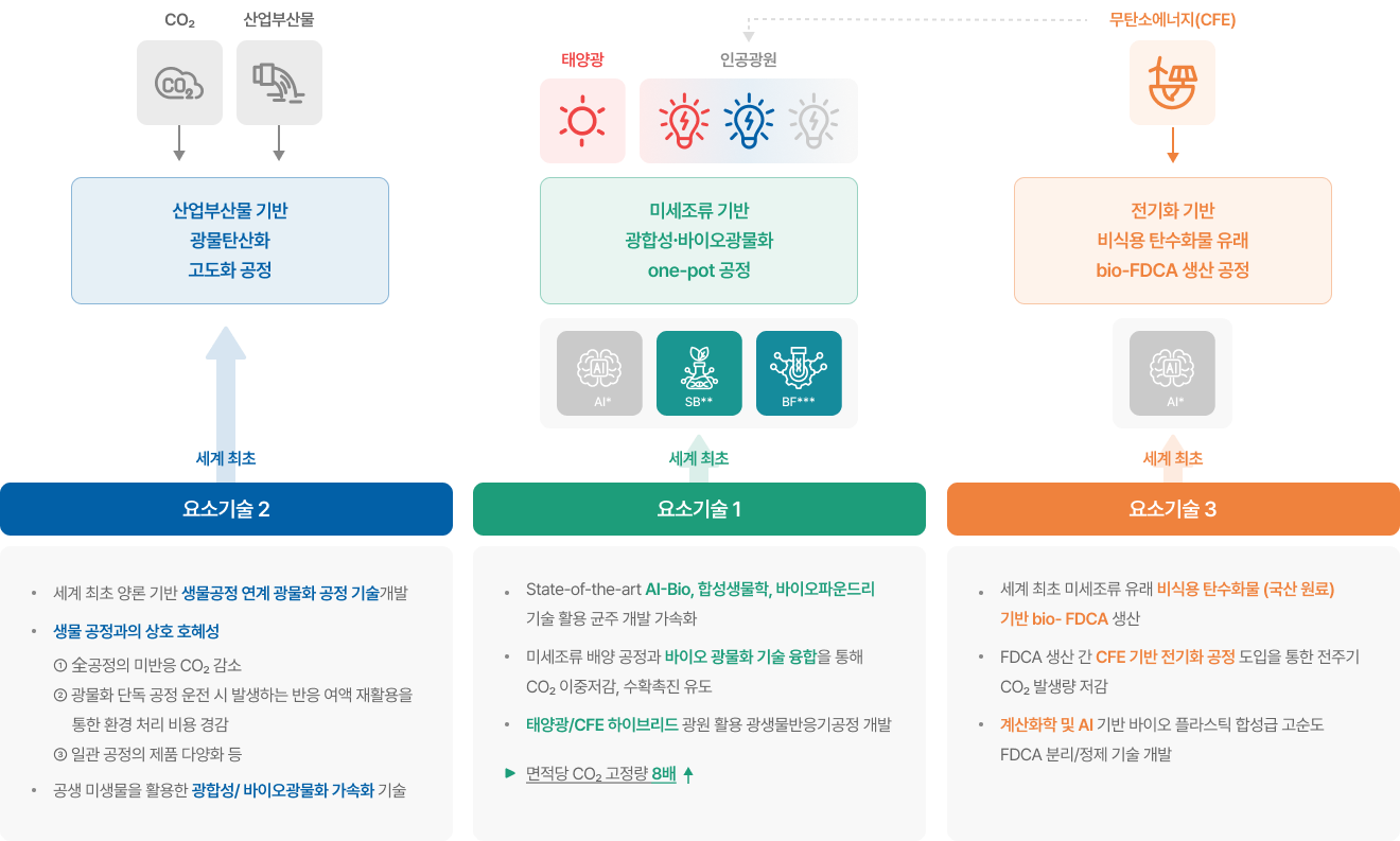 획기적으로 향상시키고 AI 기술을 활용해 미세조류 균주 개량 및 생체 촉매 효율을 고도화합니다.